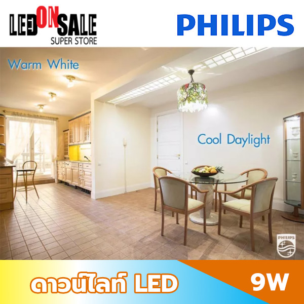 โคมไฟ ดาวน์ไลท์ LED Philips 4 นิ้ว 9W หน้ากลม แบบฝั่งฝา กรอบพลาสติกสีขาว เข้ากับสีฝา ติดแล้ว สวยแนบกับฝา ฝาด้านหน้า ที่เป็นช่องออกของแสงมีสีขาวขุ่น ทำให้แสงที่ได้นวลตา มองแล้วสบายตา ไม่บาดตา รุ่นนี้มีแสงของสี (CCT) ให้เลือกทั้งแสงสีขาวเดย์ไลท์ (Daylight) และแสงสีเหลือง วอร์มไวท์ (Warm White)
